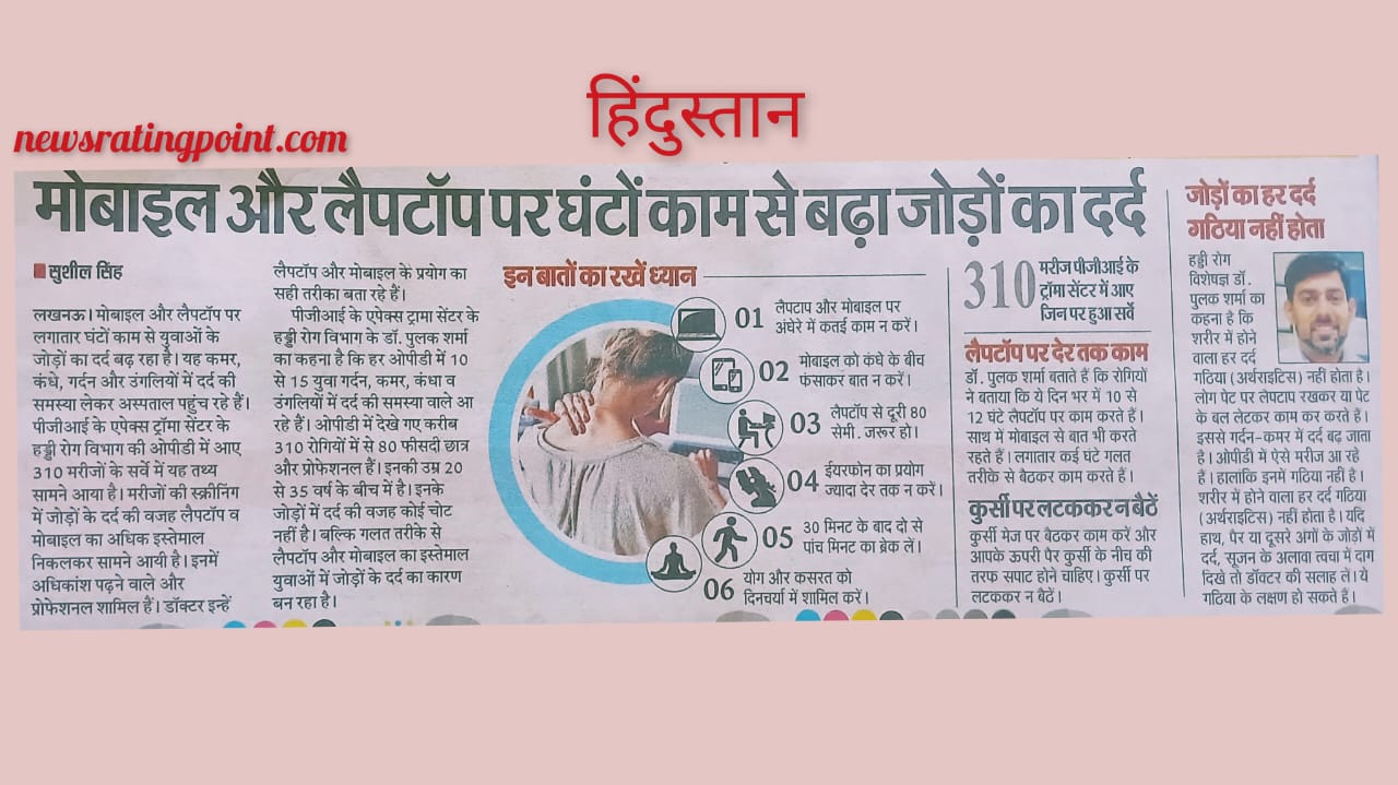 लखनऊ। मोबाइल और लैपटॉप पर लगातार घंटों काम से युवाओं के जोड़ों का दर्द बढ़ रहा है। यह कमर, कंधे, गर्दन और उंगलियों में दर्द की समस्या लेकर अस्पताल पहुंच रहे हैं। पीजीआई के एपेक्स ट्रॉमा सेंटर के हड्डी रोग विभाग की ओपीडी में आए 310 मरीजों के सर्वे में यह तथ्य सामने आया है। मरीजों की स्क्रीनिंग में जोड़ों के दर्द की वजह लैपटॉप व मोबाइल का अधिक इस्तेमाल निकलकर सामने आयी है। इनमें अधिकांश पढ़ने वाले और प्रोफेशनल शामिल हैं। डॉक्टर इन्हें लैपटॉप और मोबाइल के प्रयोग का सही तरीका बता रहे हैं। पीजीआई के एपेक्स ट्रामा सेंटर के हड्डी रोग विभाग के डॉ. पुलक शर्मा का कहना है कि हर ओपीडी में 10 से 15 युवा गर्दन, कमर, कंधे व उंगलियों में दर्द की समस्या वाले आ रहे हैं। ओपीडी में देखे गए करीब 310 रोगियों में से 80 फीसदी छात्र और प्रोफेशनल हैं। इनकी उम्र 20 से 35 वर्ष के बीच में है। इनके जोड़ों में दर्द की वजह कोई चोट नहीं है। बल्कि गलत तरीके से लैपटॉप और मोबाइल का इस्तेमाल युवाओं में जोड़ों के दर्द का कारण बन रहा है।
