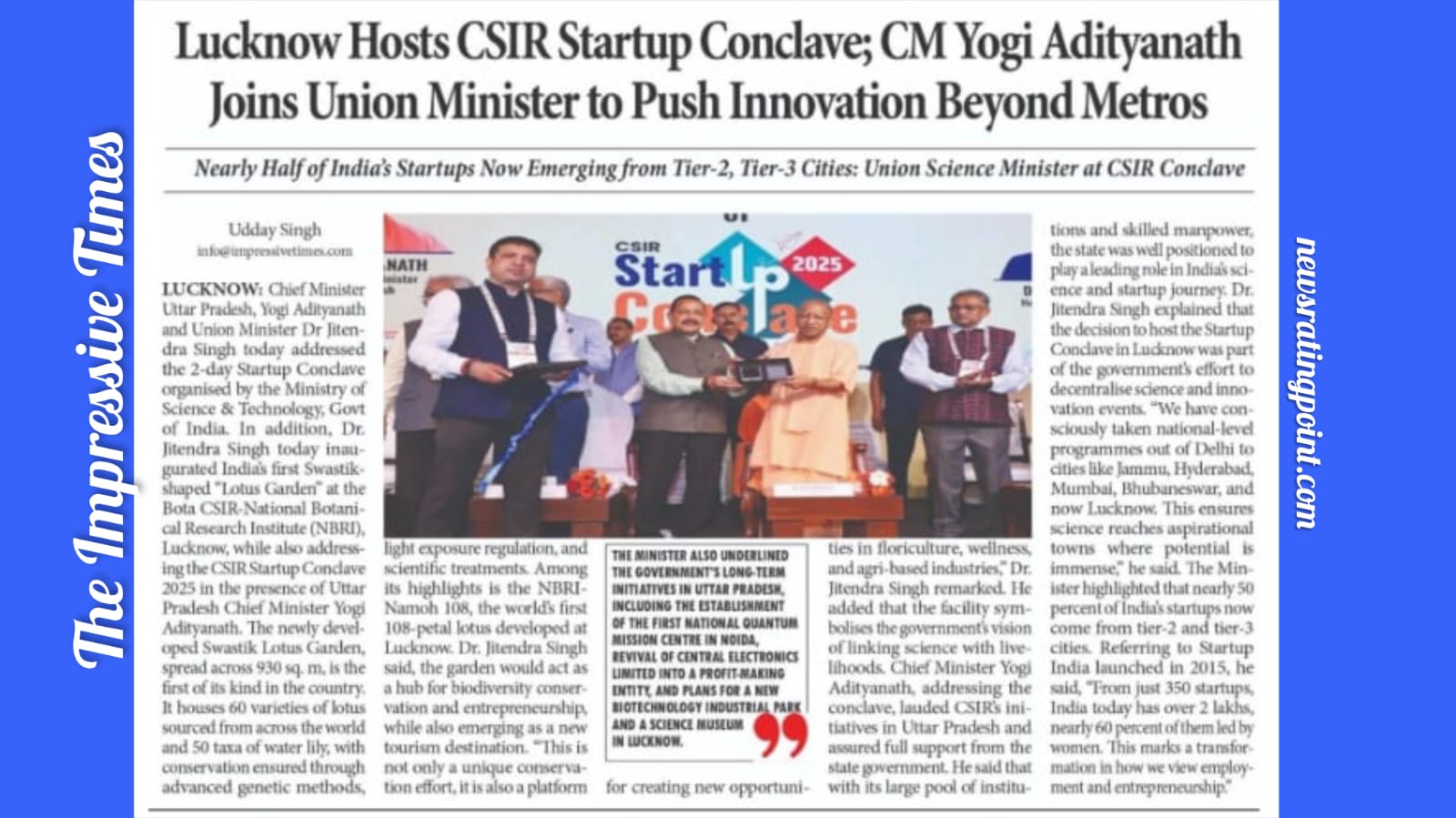 Lucknow: Chief Minister Uttar Pradesh, Yogi Adityanath and Union Minister Dr Jitendra Singh today addressed the 2-day Startup Conclave organised by the Ministry of Science & Technology, Govt of India. In addition, Dr. Jitendra Singh today inaugurated India’s first Swastik-shaped “Lotus Garden” at the Bota CSIR-National Botanical Research Institute (NBRI), Lucknow, while also addressing the CSIR Startup Conclave 2025 in the presence of Uttar Pradesh Chief Minister Yogi Adityanath. The newly developed Swastik Lotus Garden, spread across 930 sq. m, is the first of its kind in the country. It houses 60 varieties of lotus sourced from across the world and 50 taxa of water lily, with conservation ensured through advanced genetic methods, light exposure regulation, and scientific treatments. Among its highlights is the NBRI-Namoh 108, the world’s first 108-petal lotus developed at Lucknow. Dr. Jitendra Singh said, the garden would act as a hub for biodiversity conservation and entrepreneurship, while also emerging as a new tourism destination.  “This is not only a unique conservation effort, it is also a platform for creating new opportunities in floriculture, wellness, and agri-based industries,” Dr. Jitendra Singh remarked. He added that the facility symbolises the government’s vision of linking science with livelihoods.