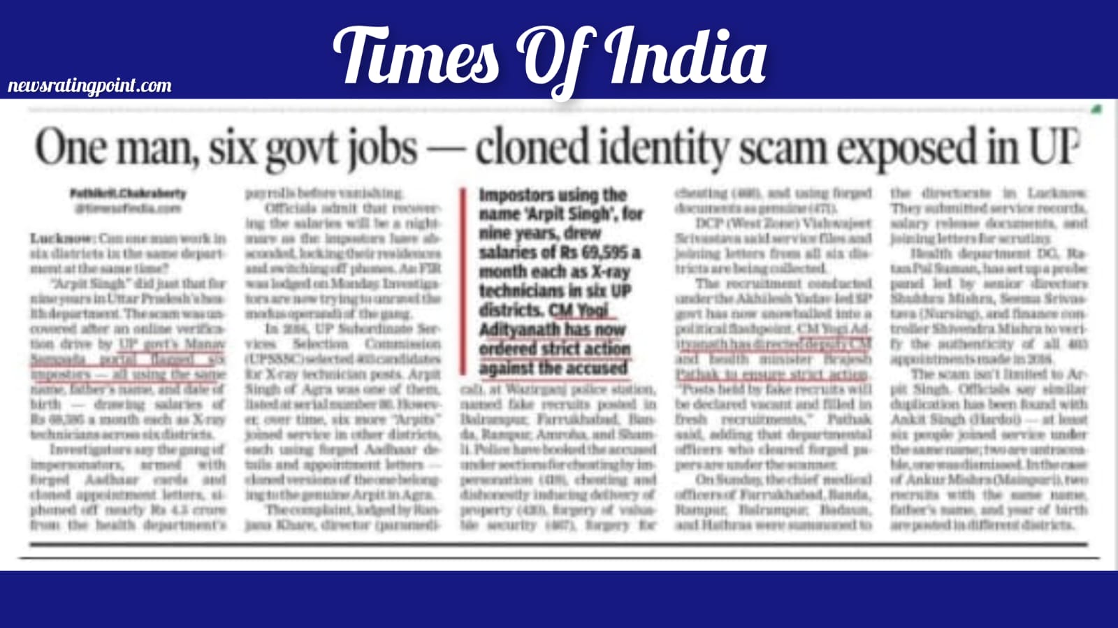 LUCKNOW: Can one person work in six different districts in the same department at the same time? “Arpit Singh” did just that for nine years in Uttar Pradesh’s health department. The astonishing scam was uncovered only after an online verification drive by UP govt’s Manav Sampada portal flagged six impostors all using the same name, father’s name, and date of birth – drawing salaries of Rs 69,595 a month each as X-ray technicians across six districts. Investigators now say the gang of impersonators, armed with forged Aadhaar cards and cloned appointment letters, siphoned off nearly Rs 4.5 crore from the health department’s payrolls before vanishing. Officials admit that recovering the salaries will be a nightmare as the impostors have absconded, locking their residences and switching off phones. An FIR was lodged on Monday. Investigators are now trying to unravel the modus operandi of the gang. In 2016, UP Subordinate Services Selection Commission (UPSSSC) selected 403 candidates for X-ray technician posts. Arpit Singh of Agra was one of them, listed at serial number 80. However, over time, six more “Arpits” joined service in other districts, each using forged Aadhaar details and appointment letters cloned versions of the one belonging to the genuine Arpit in Agra. The complaint, lodged by Dr Ranjana Khare, director (paramedical), at Wazirganj police station, named fake recruits posted in Balrampur, Farrukhabad, Banda, Rampur, Amroha, and Shamli.