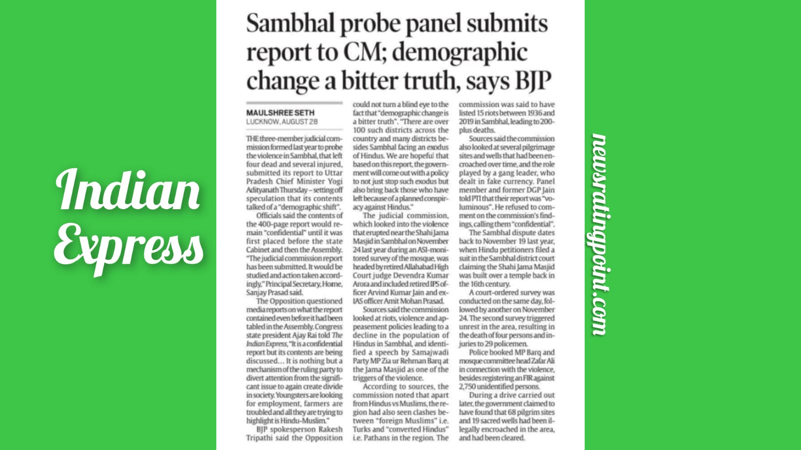 Lucknow: THE three-member judicial com mission formed last year to probe the violence in Sambhal, that left four dead and several injured, submitted its report to Uttar Pradesh Chief Minister Yogi Adityanath Thursday-setting off speculation that its contents talked of a “dernographic shift, Officials said the contents of the 400-page report would re-main “confidential” until it was first placed before the state Cabinet and then the Assembly. “The judicial commission report has been submitted. It would be studied and action taken accord ingly,” Principal Secretary Home, Sanjay Prasad said. The Opposition questioned mediareports on what the report contained even before it had been tabled in the Assembly. Congress state president Ajay Rai told The Indian Express, “It is a confidential report but its contents are being discussed… It is nothing but a mechanism of the ruling party to divert attention from the significant issue to again create divide in society, Youngsters are looking for employment, farmers are troubled and all they are trying to highlight is Hindu-Muslim” BJP spokesperson Rakesh Tripathi said the Opposition could not turn a blind eye to the fact that “demographic change is a bitter truth”. “There are over 100 such districts across the country and many districts be-sides Sambhal facing an exodus of Hindus. We are hopeful that hased on this report, the guvernment will come out with a policy to not just stop such exodus but aso bring back those who have left becane of a planned conspir acy against Hindus” The judicial commission, which looked into the violence that erupted near the Shahi Jama Masjid in Sambhal on November 24 last year during an ASI-moni-tored survey of the mosque, was headed by retired Allahabad High Court judge Devendra Kumar Arota and included retired IPS of ficer Arvind Kumar Jain and ex-IAS officer Amit Mohan Prasad.
