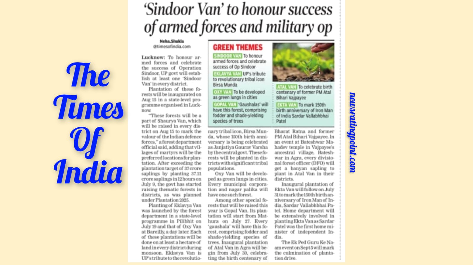 Lucknow: To honour armed forces and celebrate the success of Operation Sindoor, UP govt will establish at least one ‘Sindoor Van’ in every district. Plantation of these forests will be inaugurated on Aug 15 in a state-level pro-gramme organised in Lucknow. These forests will be a part of Shaurya Van, which will be raised in every district on Aug 15 to mark the valour of the Indian defence forces, a forest department official said, adding that villages of martyrs will be the preferred locations for plantation. After exceeding the plantation target of 37 crore saplings by planting 37.21 crore saplings in 12 hours on July 9, the govt has started raising thematic forests in districts, as was planned under Plantation 2025.