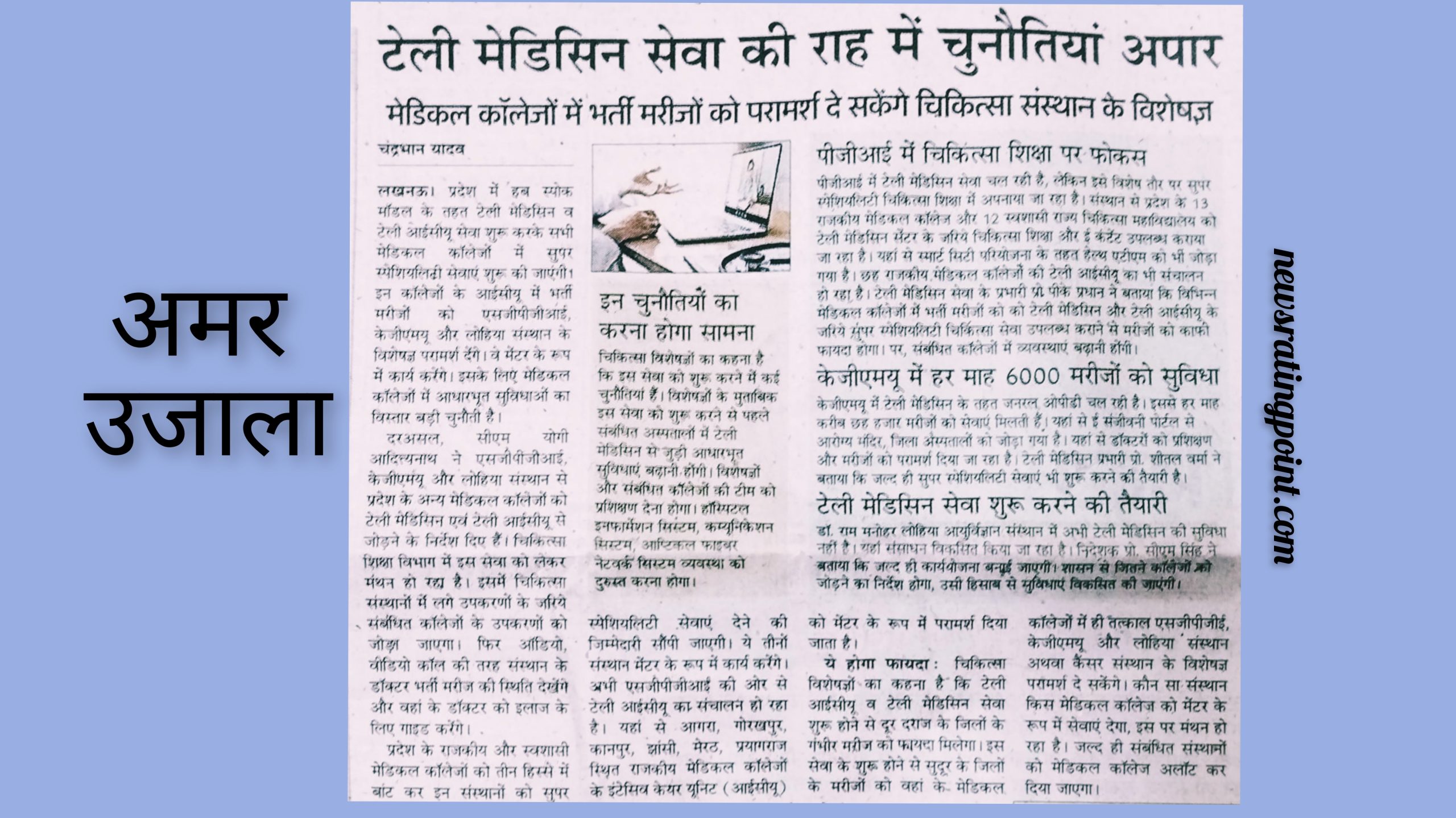 लखनऊ। प्रदेश के हब स्कोप मॉडल के तहत टेली मेडिसिन व टेली आईसीयू सेवा शुरू करके सभी मेडिकल कॉलेजों में सुपर स्पेशियलिनी सेवाएं शुरू की जाएंगी। इन कॉलेजों के आईसीयू में भर्ती मरीजों को एसजीपीजीआई के जीएमयू और लोहिया संस्थान के विशेषज्ञ परामर्श देंगे। वे मेंटर के रूप में कार्य करेंगे। इसके लिए मेडिकल कॉलेजों में आधारभूत सुविधाओं का विस्तार बड़ी चुनौती है। दरअसल, सीएम योगों आदित्यनाथ ने एसजीपीजीआई के जीएमयू और लोहिया संस्थान से प्रदेश के अन्य मेडिकल कॉनर्जी को टेली मेडिसिन एवं टेली आईसीयू से जीदने के निर्देश दिए हैं। चिकित्सा शिक्षा विभाग में इस सेवा को लेकर मंथन हो रहा है। इसमें चिकित्सा संस्थानों में लगे उपकरणों के जरिये संबंधित कनिजों के उपकरणों को मोक्ष जाएगा। फिर ऑडियो, वीडियों कॉल की तरह संस्थान के डॉक्टर भर्ती मरीज़ की स्थिति देखेंगे और वहाँ के डॉक्टर को इलाज के लिए गाइड करेंगे।