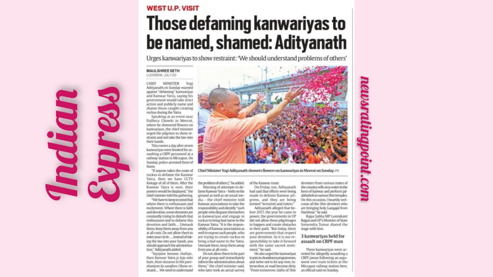 Lucknow: Uttar Pradesh Chief Minister Yogi Adityanath on Sunday warned against “defaming” kanwariyas and Kanwar Yatra, saying his government would take strict action and publicly name and shame those caught creating ruckus during the Yatra. Speaking at an event near Dulhera Chowki in Meerut, where he showered flowers on kanwariyas, the chief minister urged the pilgrims to show restraint and not take the law into their hands. This comes a day after seven kanwariyas were booked for assaulting a CRPF personnel at a railway station in Mirzapur. On Sunday, police arrested three of them. “If anyone takes the route of ruckus to defame the Kanwar Yatra, then we have CCTV footage of all of them. After the Kanwar Yatra is over, their posters would be displayed,” the chief minister told the gathering. “We have to keep in mind that where there is enthusiasm and excitement. Where there is faith and devotion, some elements are constantly trying to disturb that enthusiasm and to defame this devotion and faith… Unmask them, keep them away from you at all costs. Do not allow them to enter your circle. …instead of taking the law into your hands, you should approach the administration,” Adityanath added.