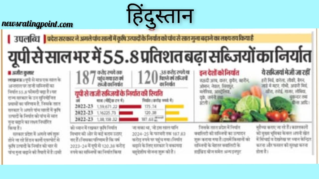 लखनऊ। यूपी से मात्र एक साल के अन्तराल पर ताजी सब्जियों का निर्यात 55.8 फीसदी बढ़ा है। यह राज्य सरकार के उन सुनियोजित प्रयासों का परिणाम है, जिसके तहत सरकार ने अगले पांच सालों में कृषि उत्पादों के निर्यात को पांच से सात गुना बढ़ाने का लक्ष्य निर्धारित किया है। सरकार प्रदेश में अगले वर्ष शुरू होने जा रहे हिंडन कार्गो एयरपोर्ट से कृषि उत्पादों के निर्यात को चार से पांच गुना बढ़ाने की तैयारी में है। इसी को ध्यान में रखकर कृषि निर्यात विभाग की ओर से कई कदम उठाए गए हैं। जिसका परिणाम है कि वर्ष 2023-24 में यूपी से 120.38 करोड़ रुपये का सब्जियों का निर्यात किया जा सका था, जो इस साल यानि 2024-25 के फरवरी तक 187.83 करोड़ रुपये पर पहुंच गया। निर्यात बढ़ाने के लिए सरकार ने बकायदा बहुद्देशीय योजना शुरू की है। जिसके तहत प्रदेश में निर्यात क्वालिटी की सब्जियों का उत्पादन शुरू कराया गया है। इसमें किसानों को सब्जियों के बेहतर क्वालिटी के हाईब्रिड बीज समेत अन्य इनपुट मुहैय्या कराए जा रहे हैं। काश्तकारों की मुख्य भूमिका केवल अपनी खेत में सिंचाई व देखरेख पर ध्यान केन्द्रित करना और फसल की सुरक्षा करना होता है।